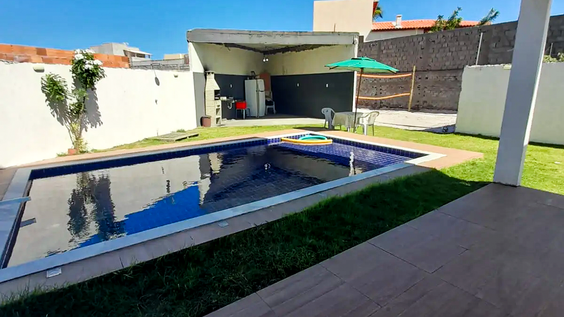Casa espaçosa com 180m², 3 quartos (1 suíte), ventiladores, sala com sofás, mesa de jantar, TV a cabo e Wi-Fi. Cozinha equipada com eletrodomésticos, utensílios e máquina de lavar. Área de lazer com piscina, churrasqueira, quiosque e quadra de vôlei/futevôlei. Garagem para 2 carros. Um ambiente perfeito para diversão, descanso e confraternizações com família ou grupos de até 12 pessoas.